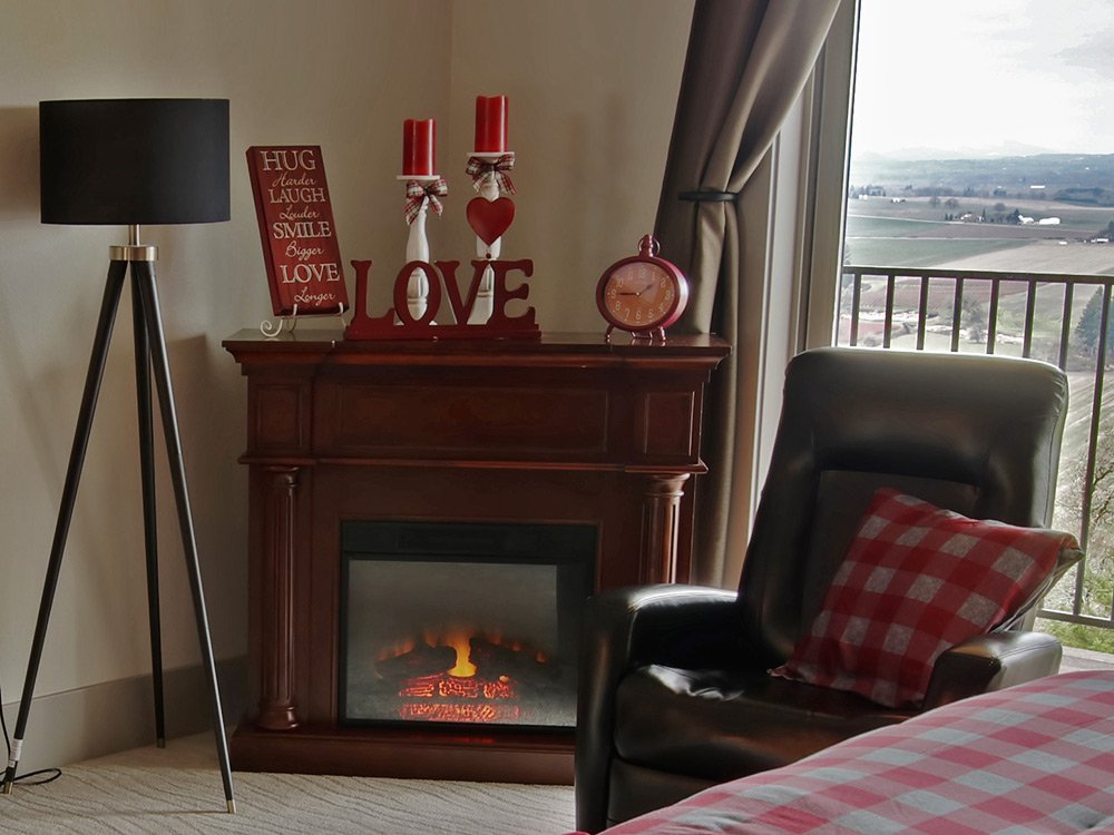 With two lounge chairs, a bistro table, and a corner electric fireplace, this room provides an exquisitely comfortable, romantic setting to enjoy the sunset view from indoors or from the upper-level patio. The suite is 440 sq ft in size and is located on the Main level (no stairs)..
